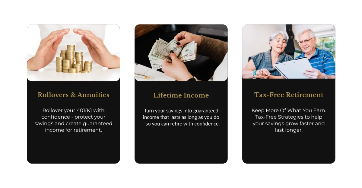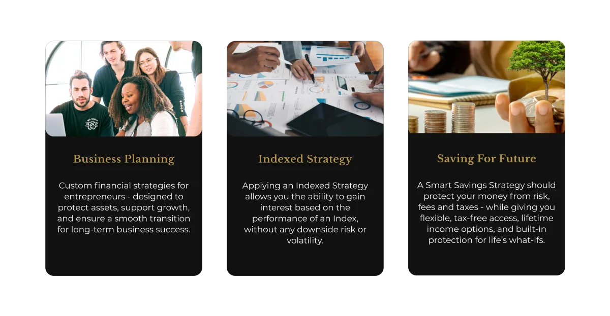 Most traditional advisors stick to conventional tools like 401(k)s, IRAs, and mutual funds. We focus on the side of finance that eliminates risks, fees and taxes — using strategies the top 1% have used for decades — and make them accessible to everyday families.
